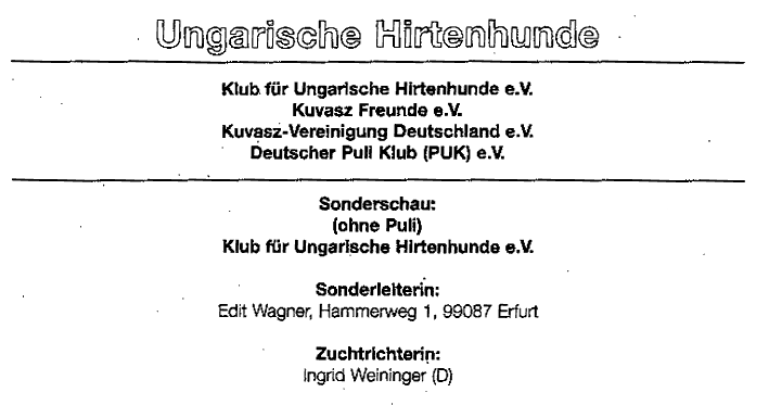 Homepage Wir stellen uns vor Unser Zwinger Zwingerbeschreibung Erfolge Unsere Hunde Informationen Welpen!!! Neue Verpaarung!! Klub f. Ung.-Hirtenh. Rassestandard Presse Seite 1 Seite 2 Seite 3 Hundebesitzer Ausstellungen 2001 Adressen Hundevermittlung Hundeverordnung
